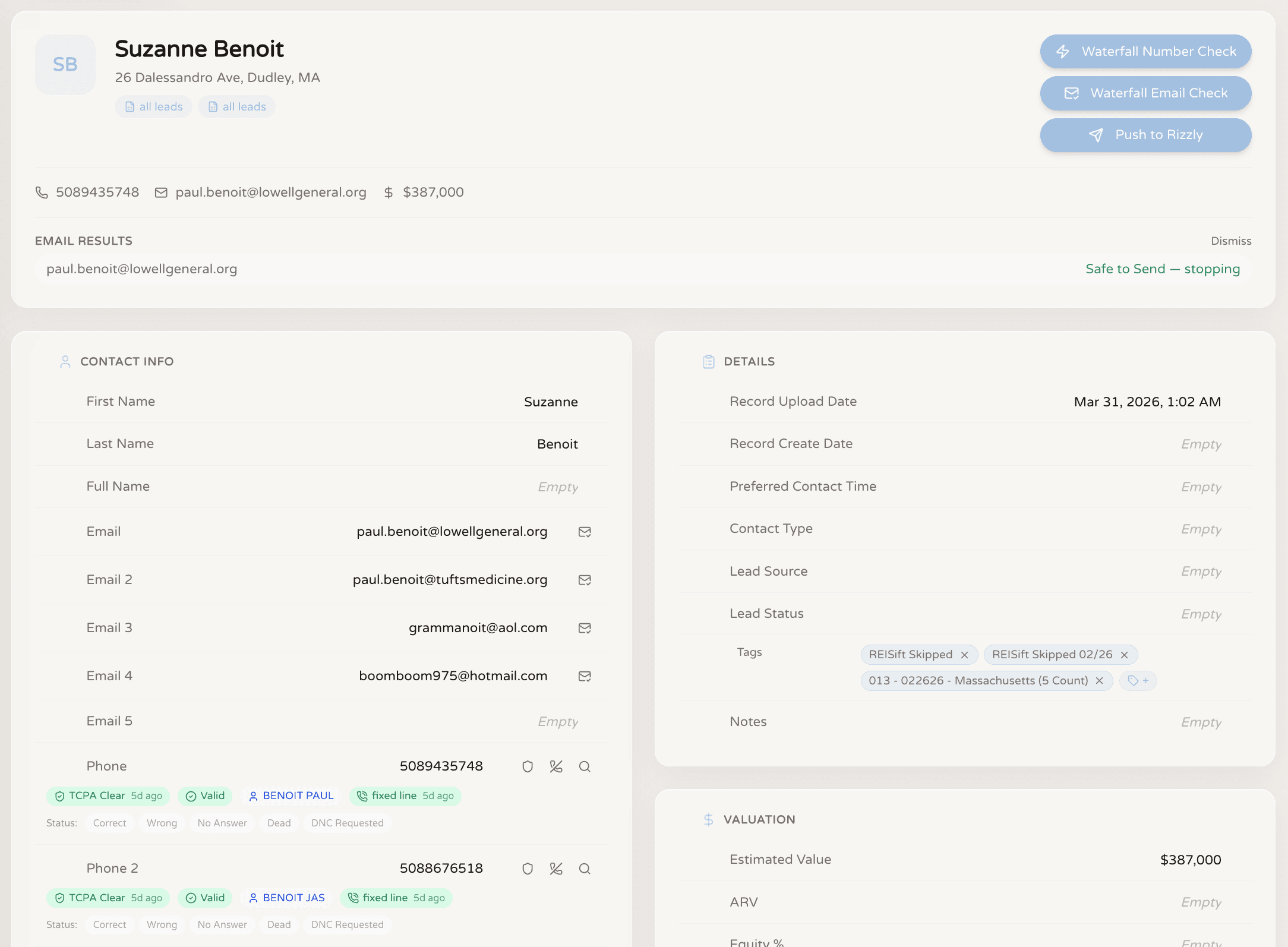 Run waterfall checks on skip-traced emails and phone numbers